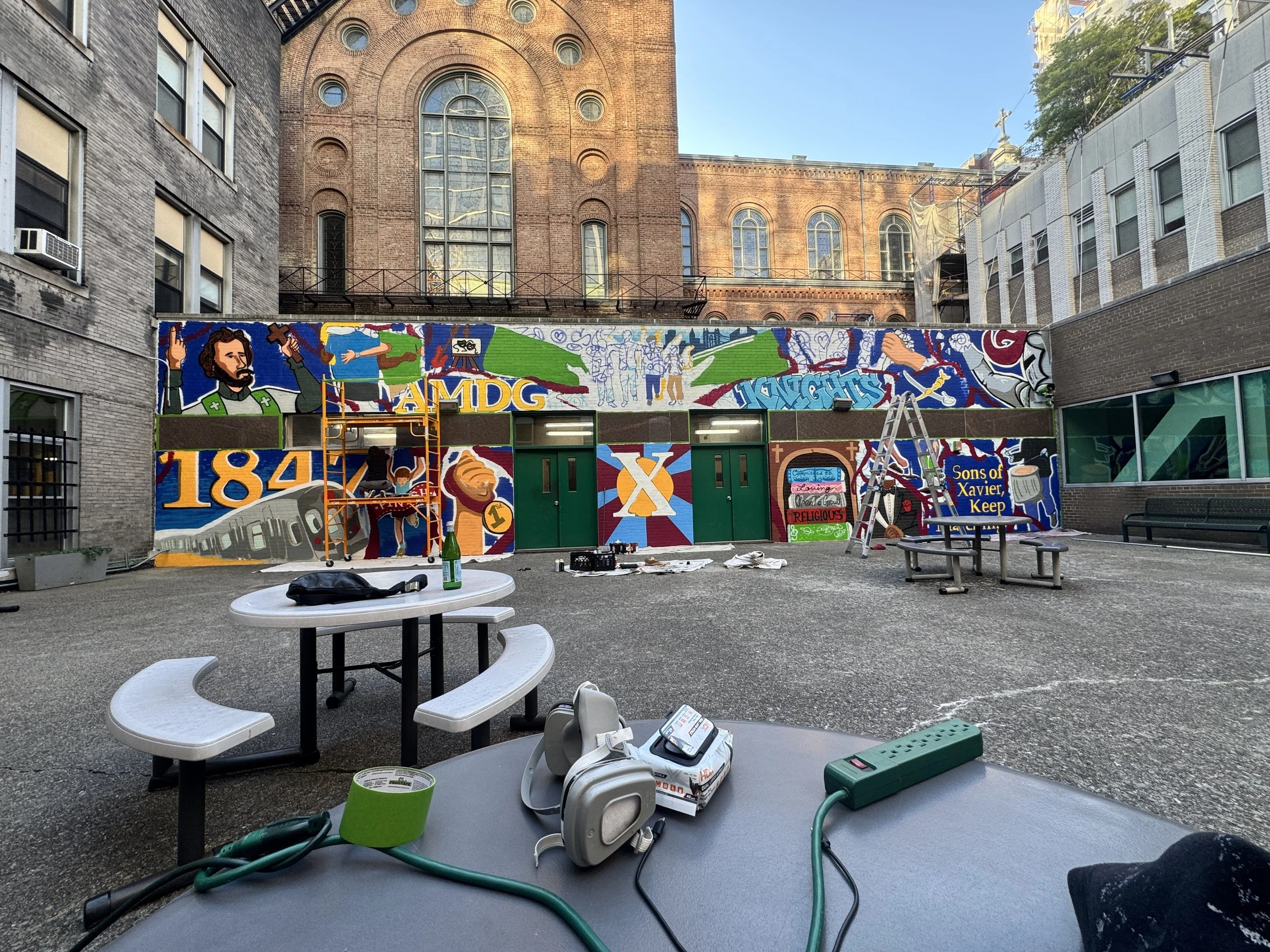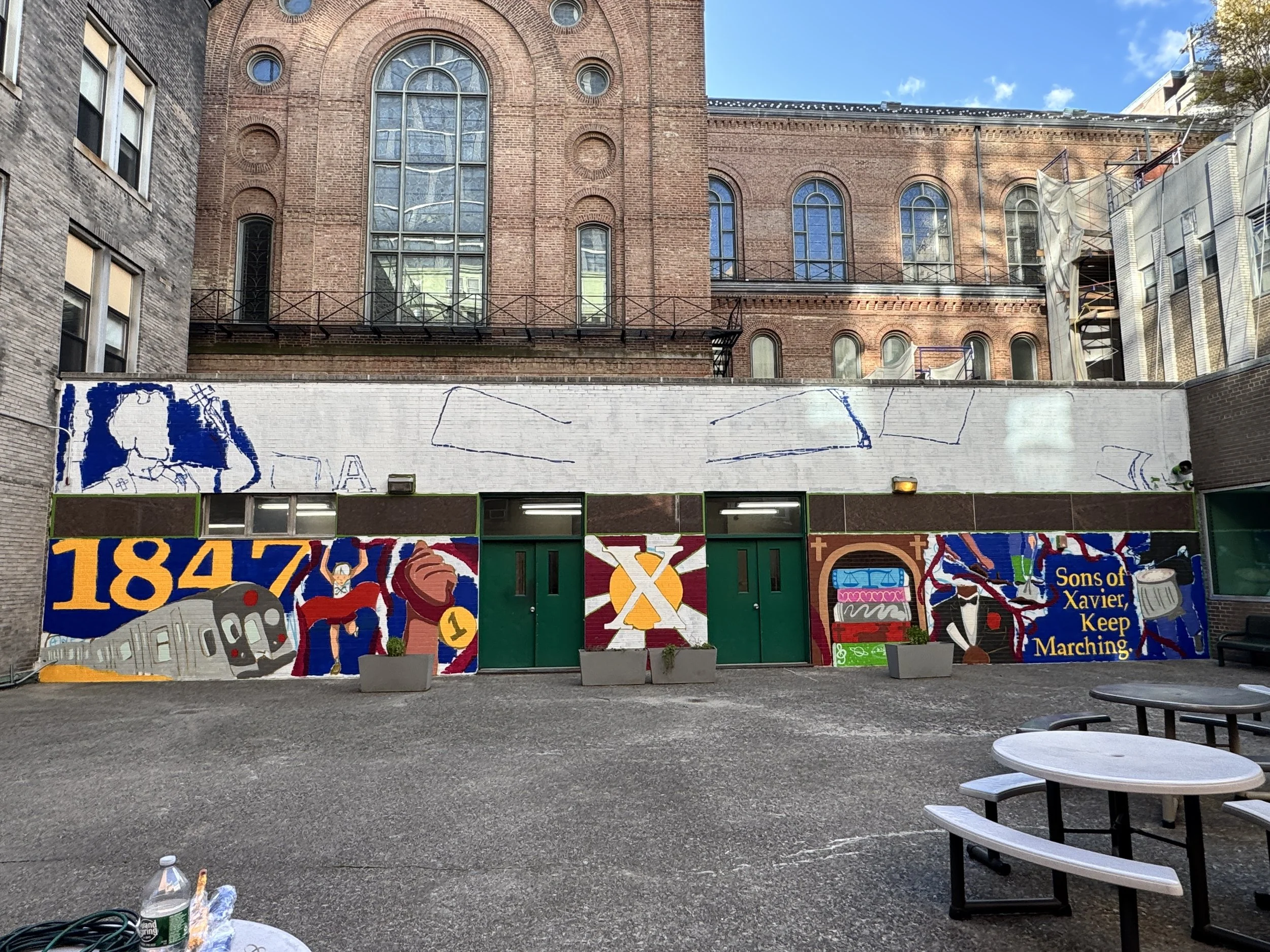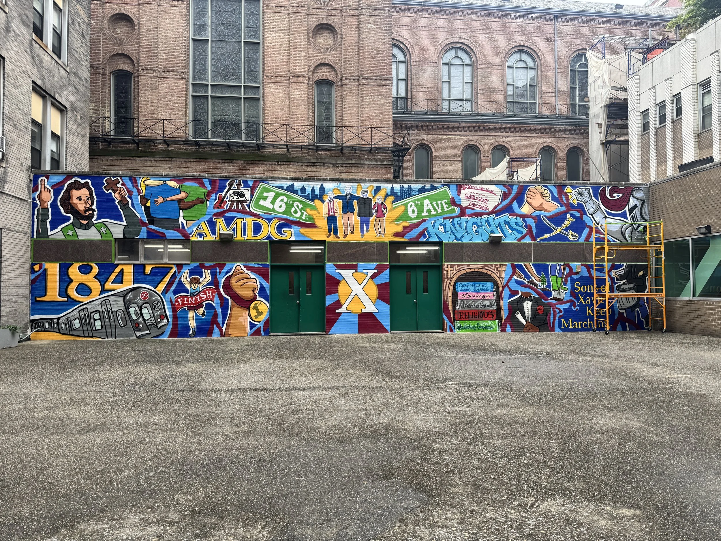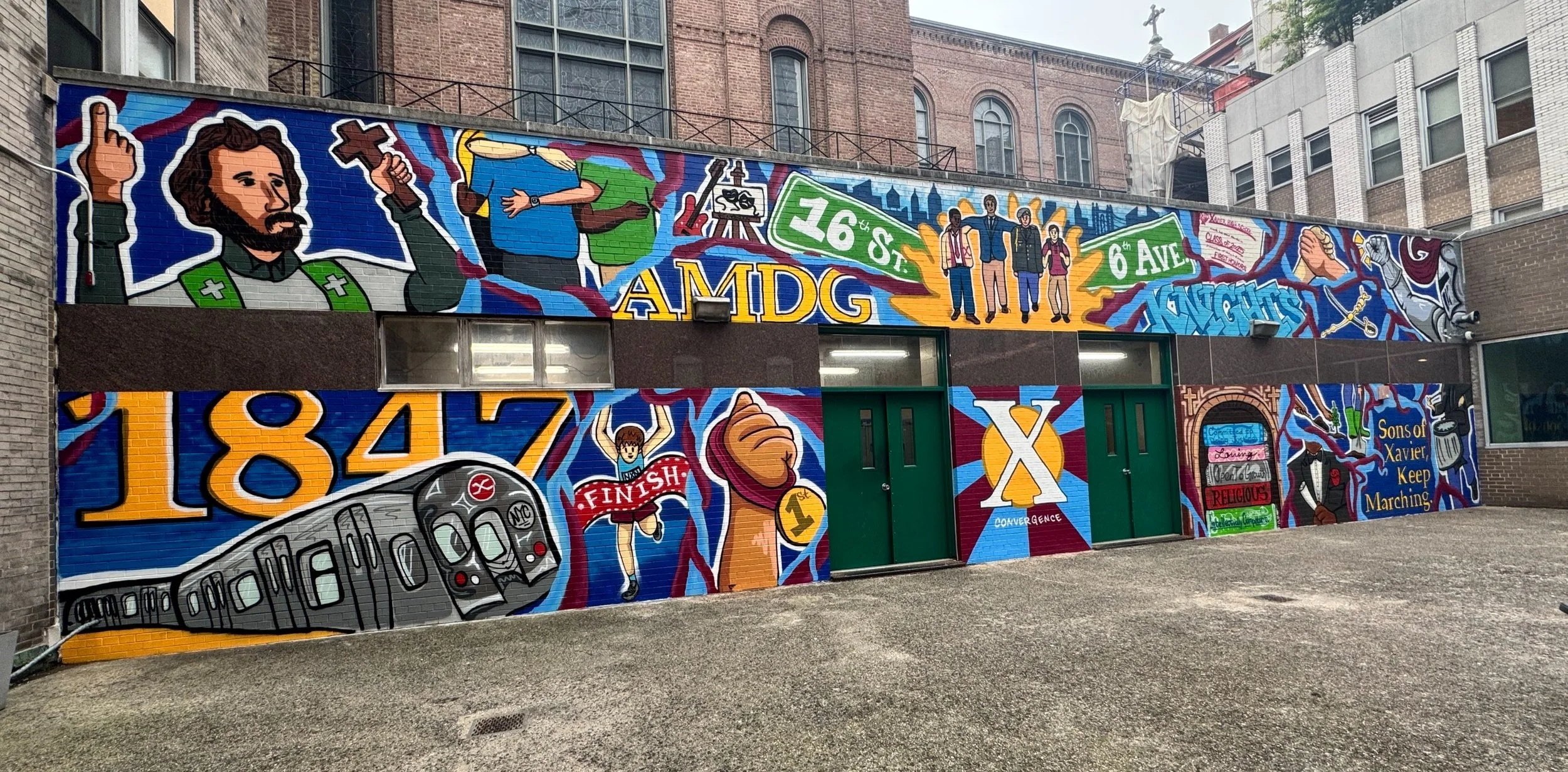 The mural focuses on four key aspects of the Xavier experience: Brotherhood, the Self, Faith and Education, Sports and Activities at the school. Elements around the mural fit into these categories and also fit into this idea of “convergence”. Students go to Xavier to learn and leave to live lives for others. The piece, then, is about that coming and going.