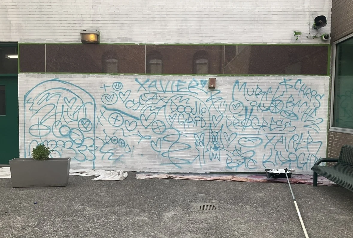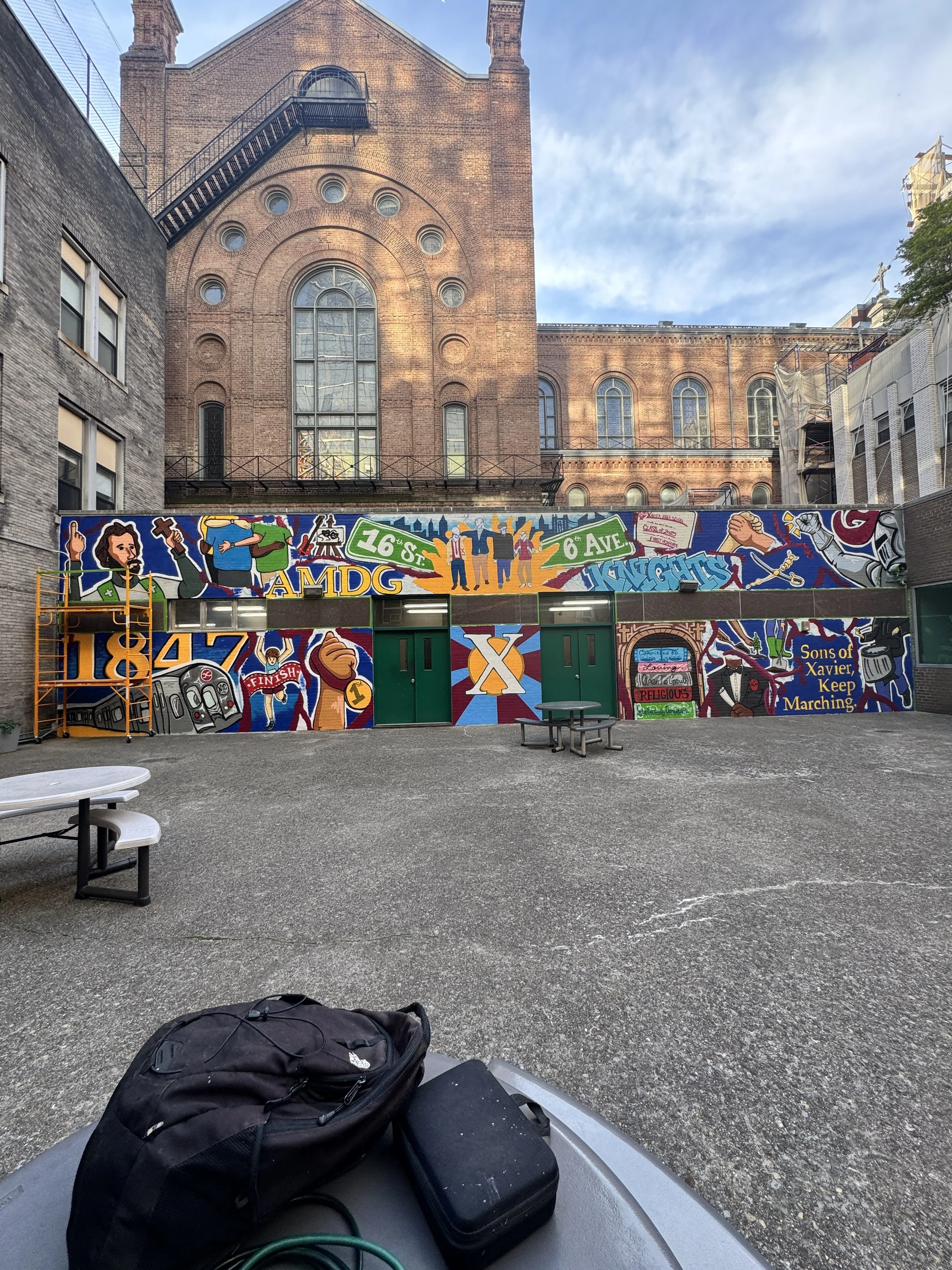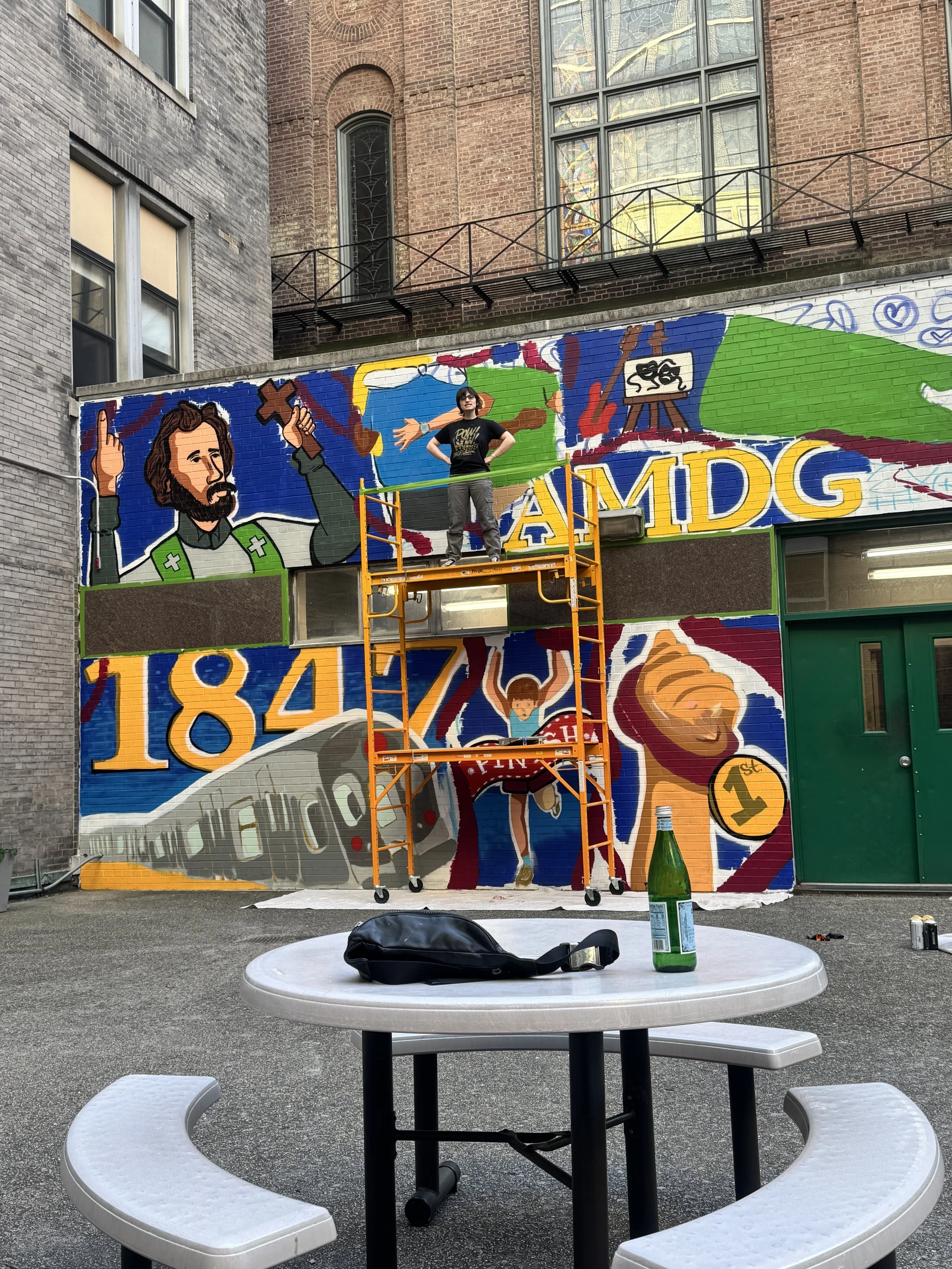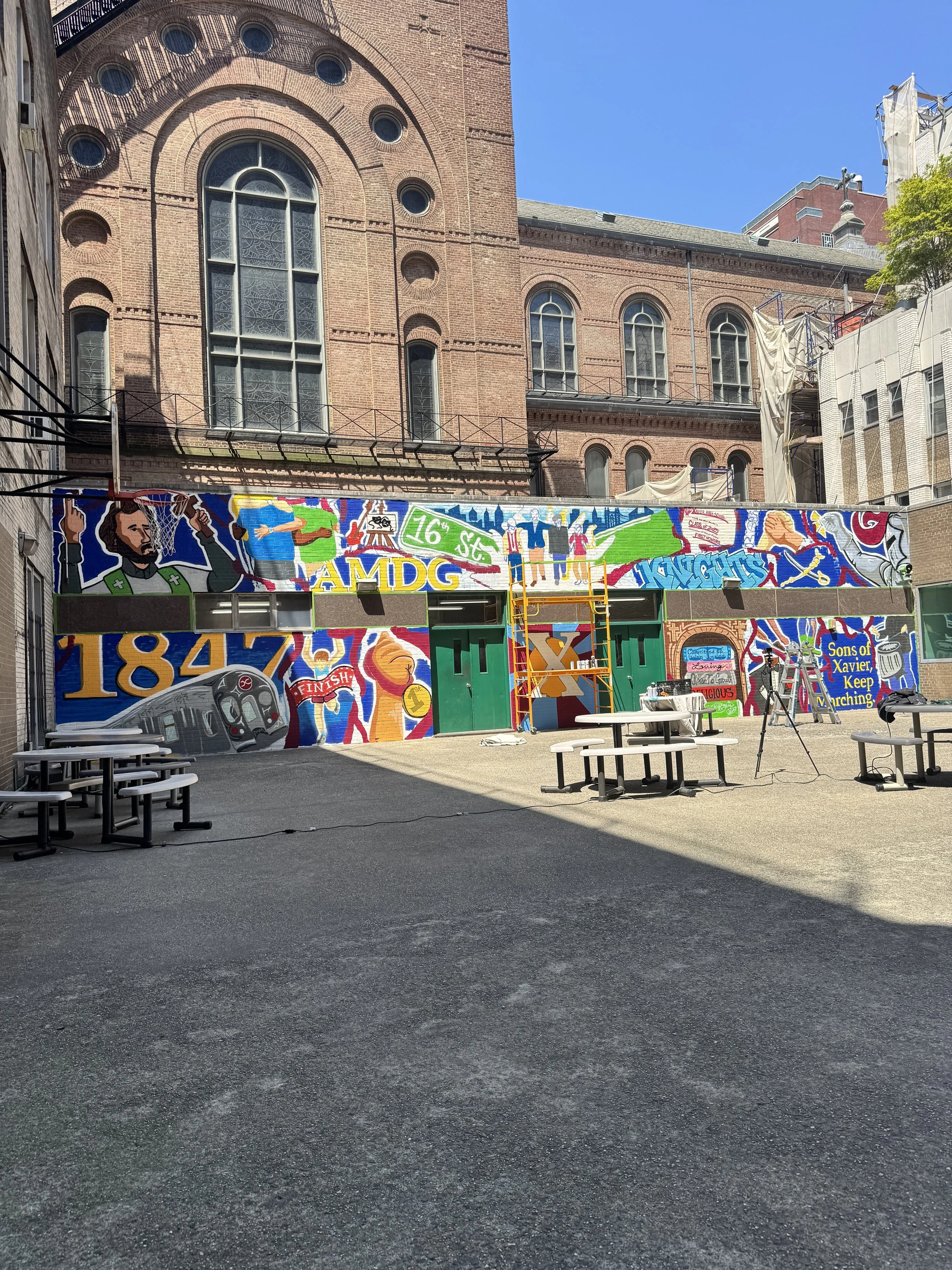 The mural focuses on four key aspects of the Xavier experience: Brotherhood, the Self, Faith and Education, Sports and Activities at the school. Elements around the mural fit into these categories and also fit into this idea of “convergence”. Students go to Xavier to learn and leave to live lives for others. The piece, then, is about that coming and going.