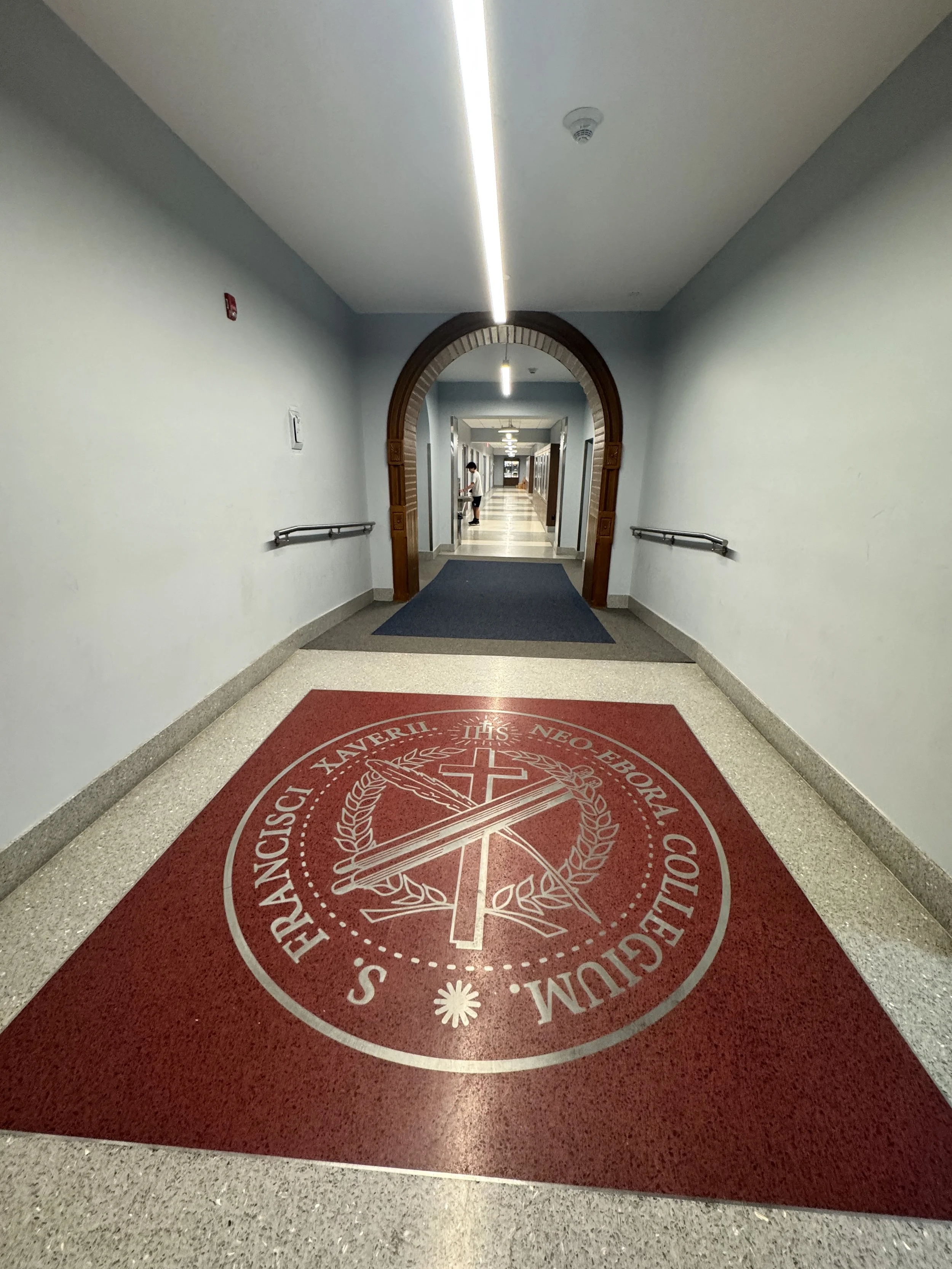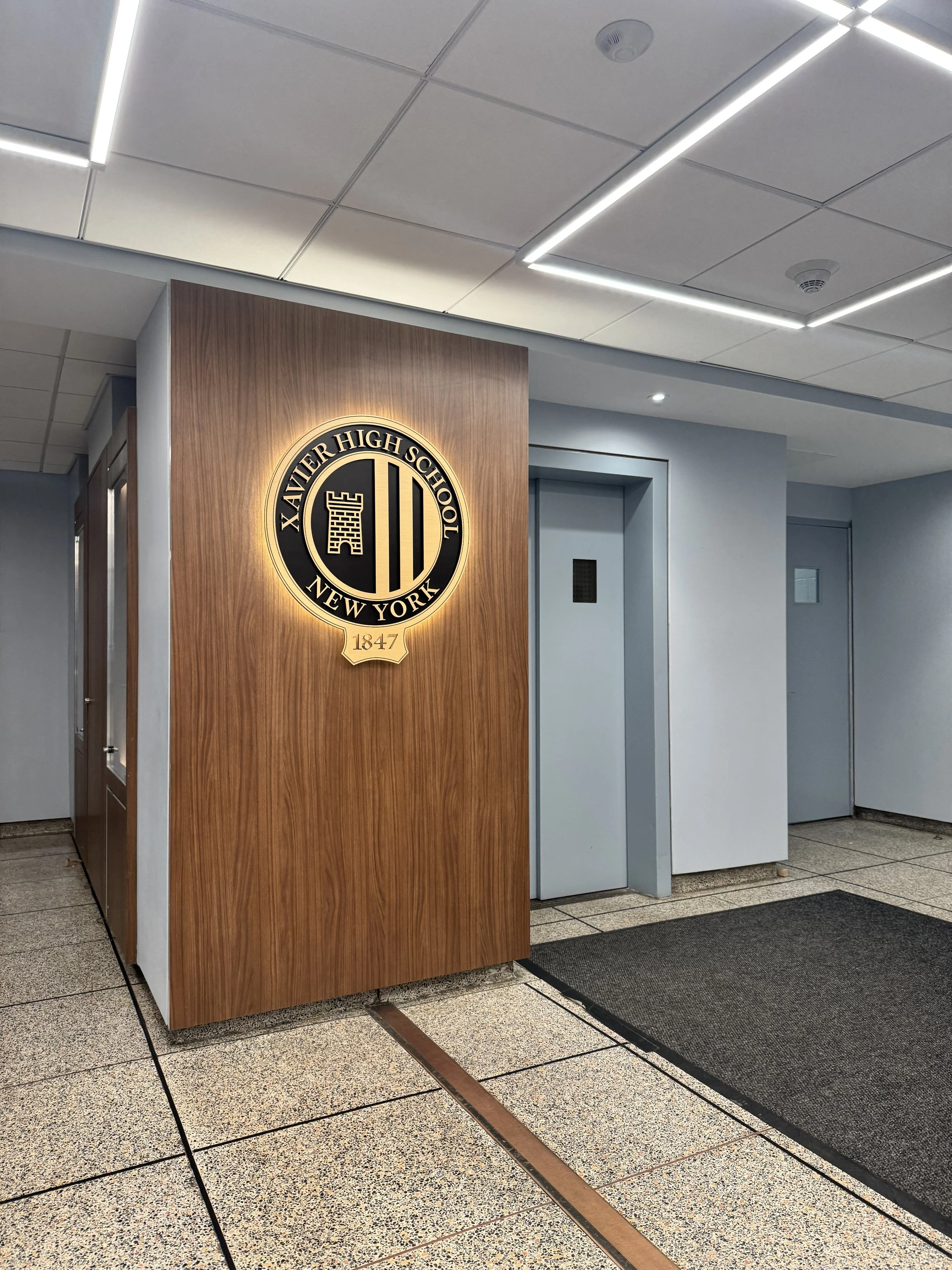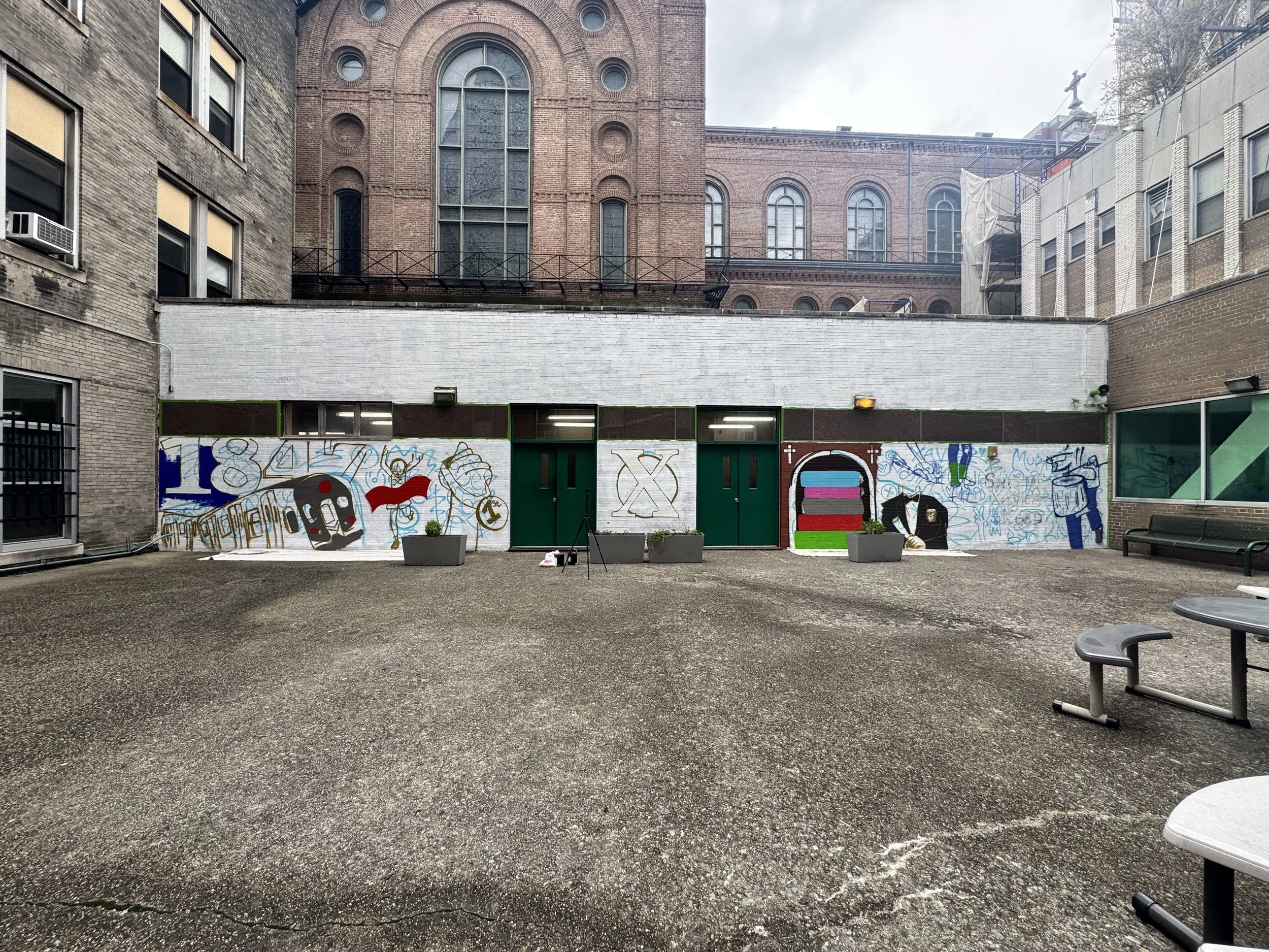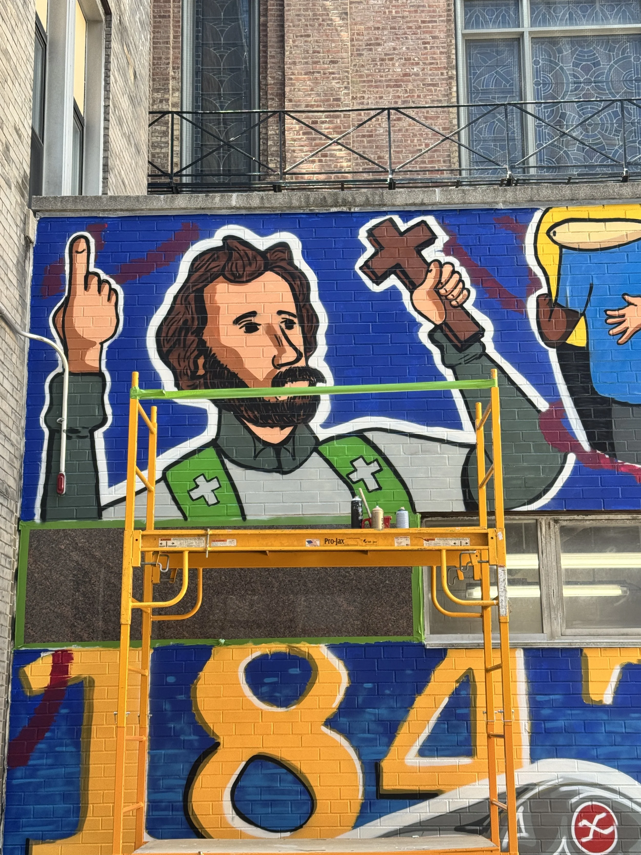 The mural focuses on four key aspects of the Xavier experience: Brotherhood, the Self, Faith and Education, Sports and Activities at the school. Elements around the mural fit into these categories and also fit into this idea of “convergence”. Students go to Xavier to learn and leave to live lives for others. The piece, then, is about that coming and going.